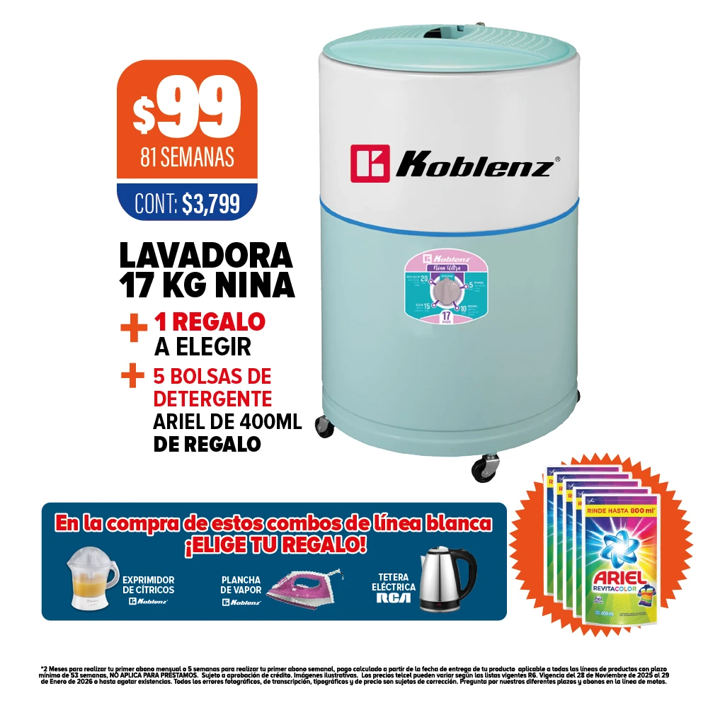 LAVADORA 17 KG NINA + 1 REGALO A ELEGIR + 5 BOLSAS DE DETERGENTE